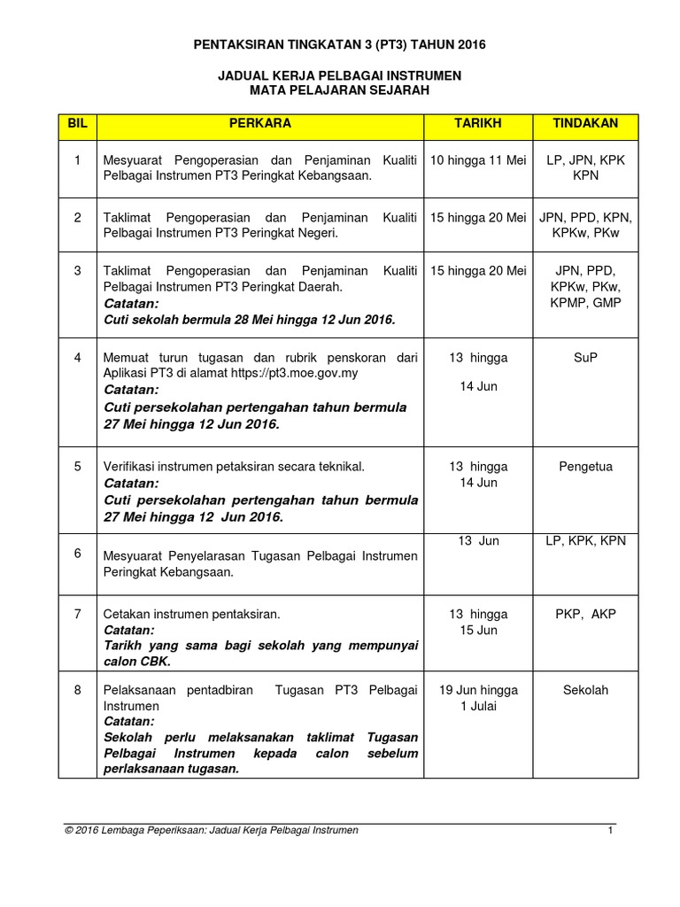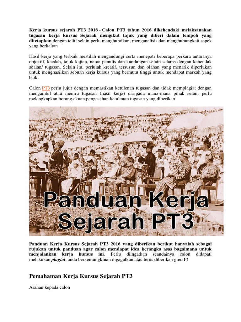 Selain itu terdapat 2 lain pentaksiran. Kerja kursus sejarah PT 3 2015. PT3 ialah sebuah penilaian yang digunakan untuk menggantikan Penilaian Menengah Rendah yang telah dijalankan sejak tahun.